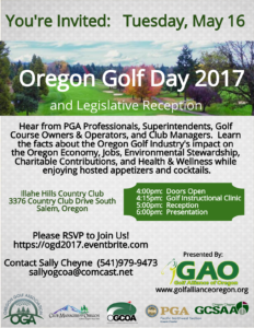 OGCSA Members you are invited to attend the 2017 Oregon Golf Day and Legislative Reception hosted by The Golf Alliance of Oregon. Come network with fellow golf industry professionals and learn the facts about the Oregon Golf Industry’s impact on the Oregon Economy, Jobs, Environmental Stewardship, Charitable Contributions, and Health & Wellness while enjoying hosted appetizers and cocktails.